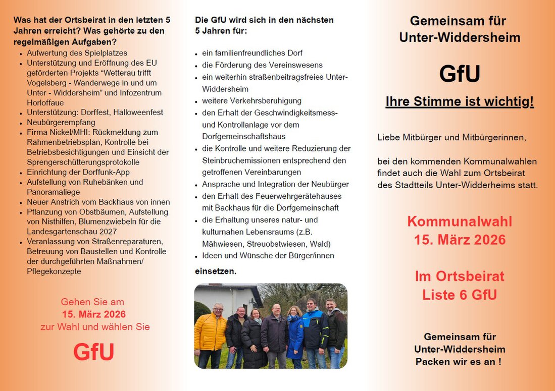 Liebe Unter-Widdersheimerinnen und Unter-Widdersheimer,wir danken für das Vertrauen in den letzten 5 Jahren und treten auch in der Kommunalwahl 2026 wieder an, damit wir uns auch in den nächsten 5 Jahren wieder für Unter-Widderheim einsetzen können.
