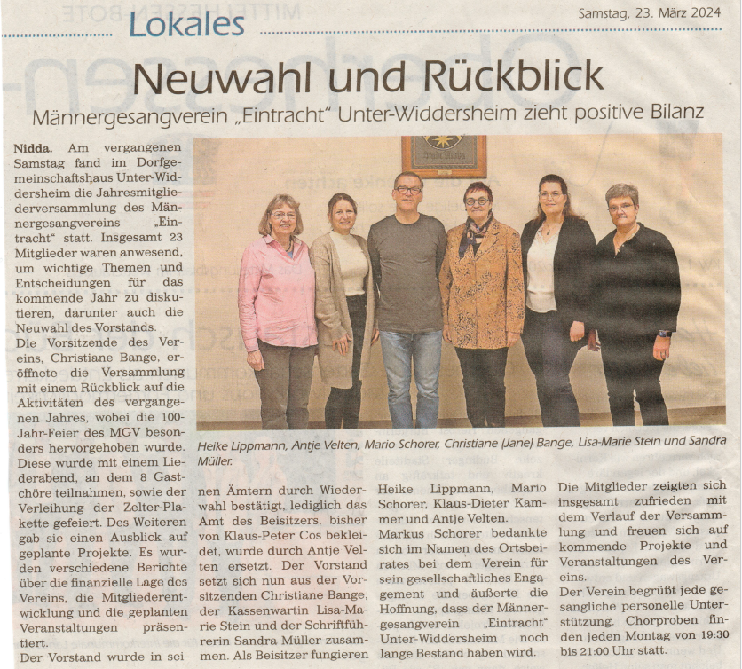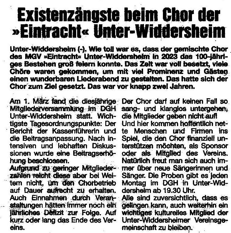 Der im Jahre 1923 gegründete Männergesangverein Eintracht Unter-Widdersheim stellt sich in den Dienst der Kunst- und Kulturpflege. Seine beiden Chöre bereiten sich in Chorproben für musikalische Auftritte und Veranstaltungen vor. Die Sängerinnen und Sänger gestalten mit ihrer Sangestätigkeit nicht nur ihre Freizeit, sondern stehen mit ihrem Wirken auch im Dienste der Öffentlichkeit, insbesondere der Dorfgemeinschaft des Stadtteils Unter-Widdersheim. Bereits ab dem jugendlichen Alter von 13/14 Jahren sind alle gesanglich Interessierte im jeweiligen Chor herzlich willkommen. Das Repertoire der Chormusik ist dem Leistungsvermögen der Chöre angepasst und reicht vom Volkslied über klassische Werke und Pop-Musik bis hin zu Shanty-Liedern im Projektchor.