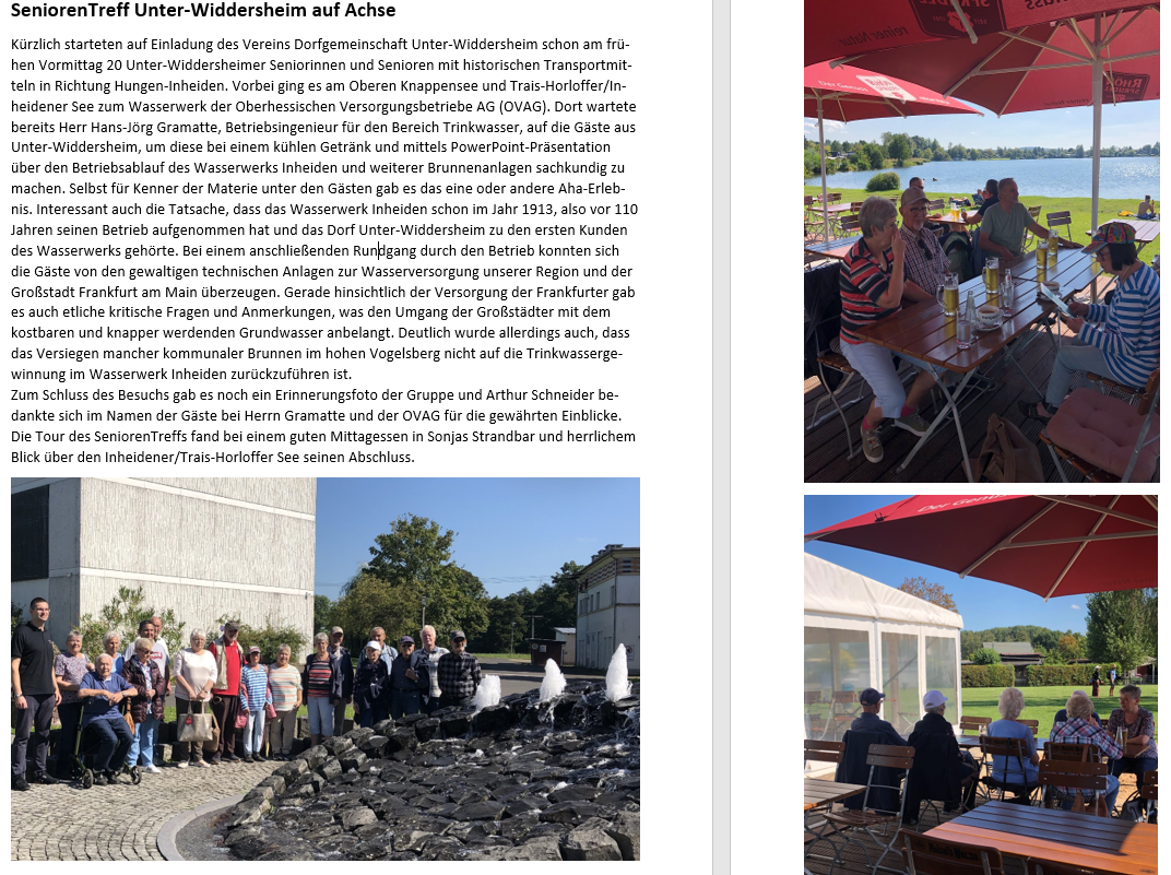 Den Anfang machte jüngst, am 21. Mai 2022, der Verein Dorfgemeinschaft Unter-Widdersheim e.V. mit einer Reise durch die nördliche Wetterauer Seenplatte. Los ging es am Dorfgemeinschaftshaus Unter-Widdersheim mit rustikalen Transportmitteln zum Oberen und Unteren Knappensee bei Utphe und zum Barbarasee bei Bellersheim. Hier konnten die 22 Teilnehmenden aus Berichten anwesender Zeitzeugen erfahren, wie aus „Restlöchern“ des Braunkohle-Tagebaus in den 1970er Jahren eine Seenlandschaft mit 3 x über 30 ha Wasserfläche und einer Tiefe bis zu 38 m Natur- und Landschaftsschutzgebiete geworden sind. Die Mehrzahl der Gäste hatte noch nie einen Blick auf diese Idyllen unweit ihres Wohnorts geworfen. Unterwegs konnten auch „Stauwerke“ des Bibers und stillgelegte Bahnstrecken in Augenschein genommen werden. Einen zünftigen Abschluss fand die Reise in „Irenes Hofcafe“ bei leckerem Kuchen und Kaffee im Hofgut Utphe.