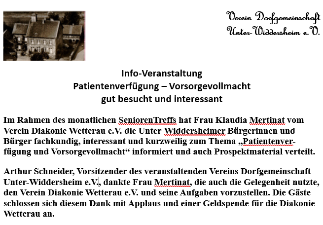 In einer Arbeitsgruppensitzung im August 2015 sind fünf Unter-Widdersheimer Vereine übereingekommen die Seniorenarbeit in unserem Dorf, soll heißen, den SeniorenTreff im Dorfgemeinschaftshaus wieder zu „beleben“. Hierzu übernehmen die Vereine im monatlichen Wechsel die eigenverantwortliche Ausrichtung und Gestaltung des einmal monatlichen SeniorenTreffs.