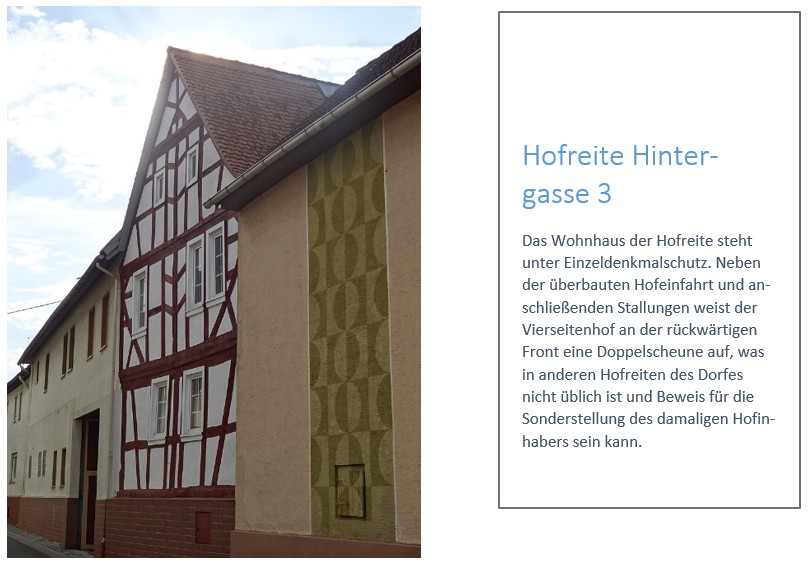 Welche Bedeutung das unter Einzeldenkmalschutz stehende Amtshaus mit Hofreite, heute Unterdorstraße 8 hatte, ist nicht geklärt. Es kann mit Sicherheit nicht das Wohnhaus des jeweiligen Bürgermeisters oder Dorfschultheissen gewesen sein, denn diese waren auch in anderen Hofreiten des Dorfes ansässig. Feststeht, dass die Familie Bindung diesen Gebäudekomplex in späterer Zeit zu Eigentum erhalten hat, denn die Nachfahren dieser Familie bewohnen heute noch das Anwesen.