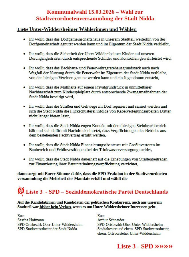 Der Ortsbezirk ist eine Gliederung der Sozialdemokratischen Partei Deutschlands im SPD-Ortsverein Nidda. Er besteht seit der kommunalen Gebietsreform und der politischen Eingemeindung unserer Dörfer in die Stadt Nidda im Jahre 1972 sowie der Vereinigung der Ortsbezirke Ober- und Unter-Widdersheim im Jahre 2007. Im Ortsbezirk haben sich Frauen und Männer zusammengefunden, die die politischen Interessen der Menschen der Stadtteile Ober- und Unter-Widdersheim durch sozialdemokratische Politik in Stadt, Kreis, Land und Bund vertreten und gewahrt sehen wollen. In der Kommunalpolitik ist auch unser sonst so beschauliches, idyllisches und liebenswertes Dorf Unter-Widdersheim nicht frei von Problemen. Straßenverkehr und Steinbruchbetrieb sowie strukturelle Veränderungen in der Landwirtschaft wirken sich auf das Dorf und seine Bewohner aus. Es gilt auch politisches Engagement der Bürgerinnen und Bürger für ihr Dorf zu fördern.